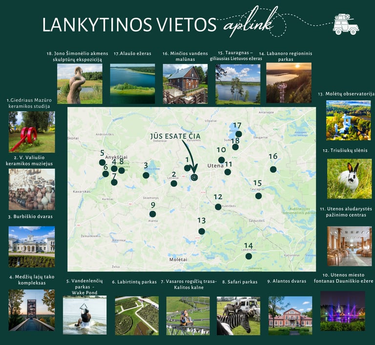 Atraskite lankytinas vietas, visai šalia Green Harmony, kurios paliks neeilinius prisiminimus. Planuokite savo kelionę ir sužinokite daugiau apie Aukštaitijos nuostabius kraštovaizdžius, istorinius dvarus ir kitas įspūdingas vietas.
